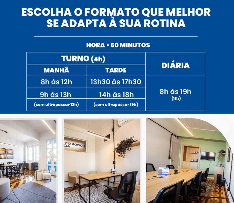Localizado na Rua Sete de Setembro, 274, no 3º andar (sala 301), o Coworking ACP funciona de segunda a sexta-feira, das 8h às 19h, em uma das regiões mais movimentadas da cidade, fator que amplia sua relevância para profissionais que circulam pelo centro e necessitam de um ponto de apoio estruturado.