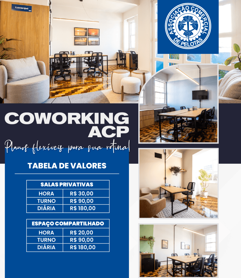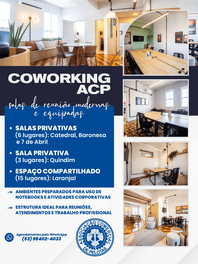 A Associação Comercial de Pelotas (ACP) apresenta à comunidade o Coworking ACP, um novo espaço voltado às conexões e negócios. A iniciativa reforça o posicionamento da entidade como agente ativo no fortalecimento do ecossistema empresarial local e acompanha uma tendência consolidada de ambientes de trabalho compartilhados, cada vez mais presentes nos grandes centros e agora também integrados à realidade de Pelotas.