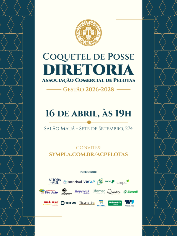 A cerimônia oficial de posse será realizada no dia 16 de abril, a partir das 19h, no Salão Mauá, no 8º andar da sede da ACP. Os convites para o coquetel já estão disponíveis em www.sympla.com.br/coquetel-de-posse-da-diretoria-gestao-2026-2028-associacao-comercial-de-pelotas